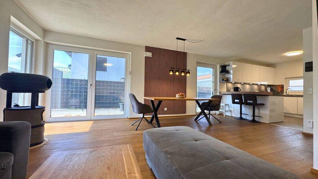 Hochwertige Materialien: Edle Eichen-Parkettböden in den Wohn- und Schlafräumen und zeitlose italienische Designfliesen in der Küche, Vorraum sowie Sanitärbereichen.