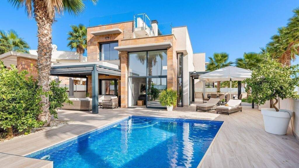 Das Haus verfügt im Erdgeschoss über einen großen Außenbereich mit Sonnenliegen, Sofagruppen, Essbereich und Lounge. Perfektes Anwesen für Leute, die das gewisse Extra wollen. Es gibt eine Außenküche mit Spüle, Grill und Platz für einen großen Esstisch, der oft ein Treffpunkt für späte Abende mit gutem Essen ist. Es gibt auch ein Stück Garten, das sich perfekt als Spielplatz für die Kleinen eignet. (Kunstrasen)