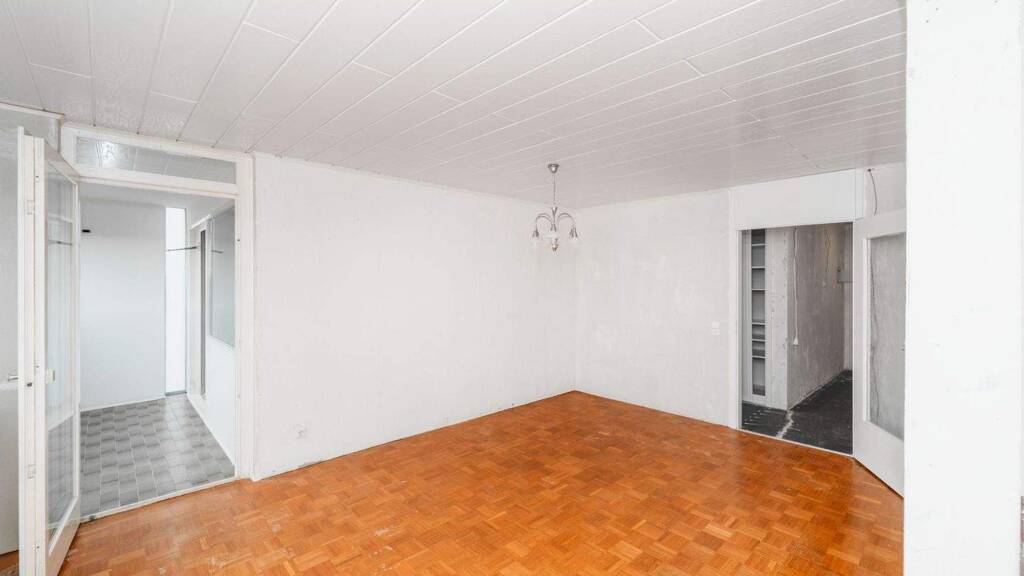 Beim Betreten der Wohnung öffnet sich der Flur zu einer separaten Küche, die aktuell durch eine Glastrennwand mit Schiebefenster vom Wohnbereich abgeteilt ist. Mit wenigen Handgriffen lässt sich diese entfernen, sodass ein großzügiger, offen gestalteter Wohn- und Essbereich entsteht.