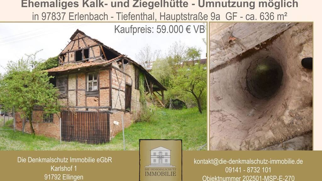 Ein Stück fränkische Industriegeschichte! Ein kleinindustrielles Fabrikationsgebäude, angepasst an die Bedürfnisse seiner ländlichen Umgebung! Eine denkmalgeschützte Rarität, die an die frühindustrielle Produktion des 19. Jahrhunderts erinnert! So lässt sich das historische Produktionsgebäude der alten Kalk- und Ziegelhütte in Tiefenthal, nahe des Weinortes Erlenbach, bei Marktheidenfeld im Mainviereck zutreffend beschreiben.