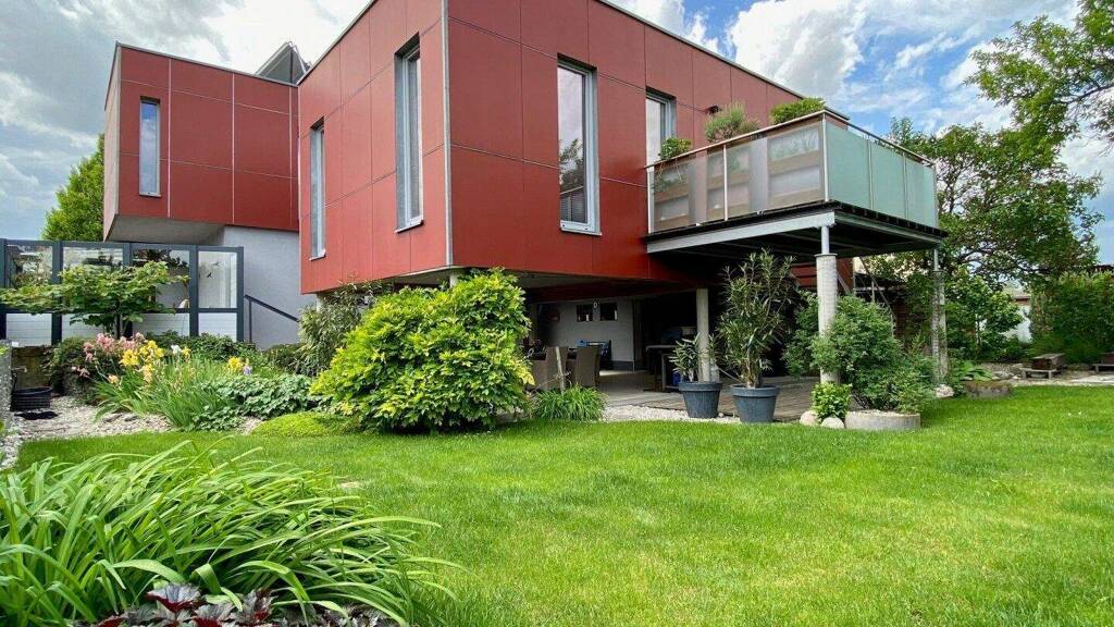 Die Bebauung gliedert sich in einen Baukubus - Altbestand 1987 - und einen Erweiterungsbau 2006 mit erdgeschossige Garage + Geräteraum.