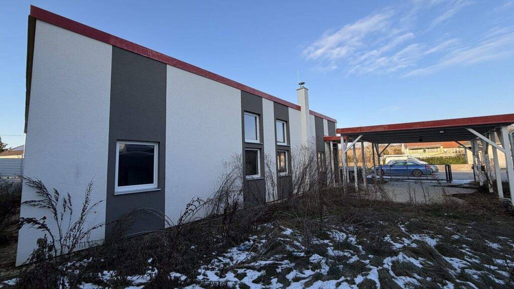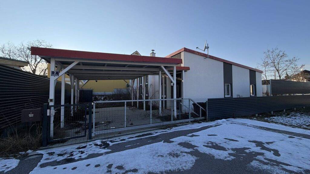 Ein überdachter Eingangsbereich und ein Autoabstellplatz runden das Angebot ab.