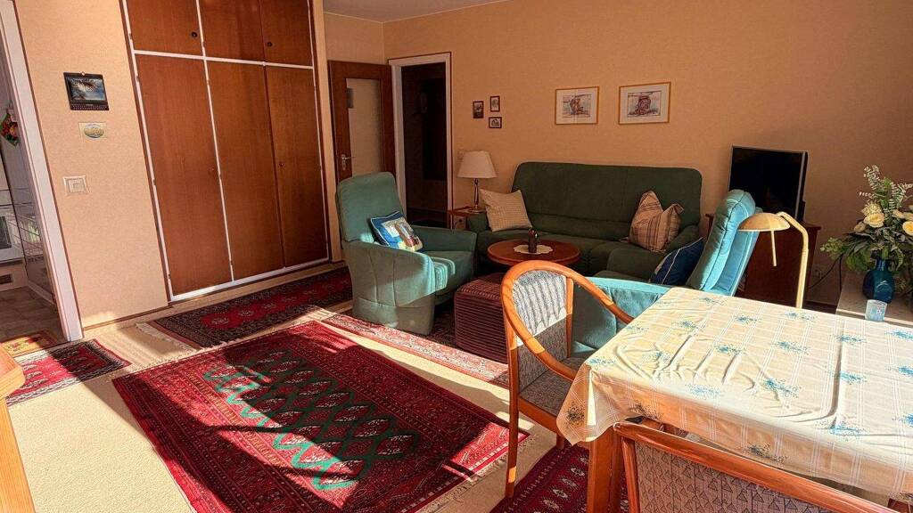 Betreten wird die Wohnung durch einen Windfang mit angeschlossenem Abstellraum und Zugang zum gepflegten Duschbad. Das große Wohnzimmer wird durch die Loggia in Südwest-Lage erweitert, sodass Sie die Sonne den ganzen Tag genießen können. Erweitert wird das Platzangebot durch eine separate Küche die funktional und platzsparend ausgestattet ist. Ein besonderer Pluspunkt ist der PKW-Stellplatz auf dem Gemeinschaftsparkplatz, der komfortables und stressfreies Parken jederzeit ermöglicht - ein echter Mehrwert in dieser beliebten Urlaubsregion. Die große Fensterfront im Wohnzimmer wurde 2015 erneuert und die Gas-Heizung der Wohnanlage in 2018.