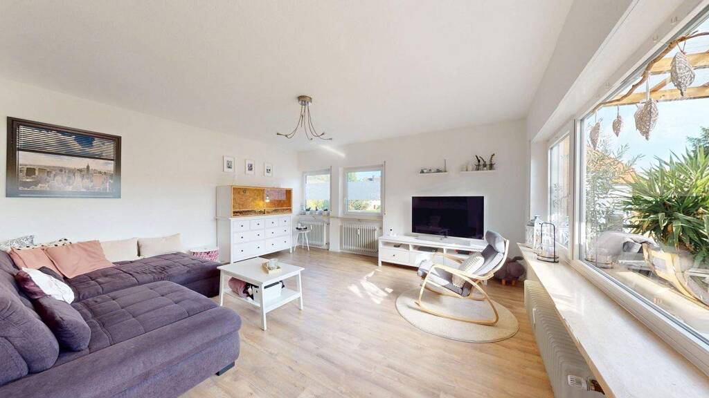 Die ca. 121 qm verteilen sich optimal auf 4,5 Zimmer im ersten Obergeschoss. Die Aufteilung überzeugt durch einen grosszügigen Eingangsbereich, der ausreichend Platz für eine grosse Garderobe bietet; zur linken Seite befindet sich ein Gäste-WC. Geradeaus gelangen Sie in den lichtdurchfluteten, offenen Wohn- und Essbereich, dessen Raumwirkung durch die vielen Fenster und den modernen Schnitt eine ganz besondere Atmosphäre erzeugt. Eine neuwertige, bestens ausgestattete Küche lässt dem Hobbykoch keine Wünsche offen. Über den Flur gelangen Sie zu einem Büro-/Kinderzimmer mit Anbindung an ein helles Schlafzimmer, während ein weiteres, sehr geräumiges Schlafzimmer ausreichend Platz für die Familie bietet.