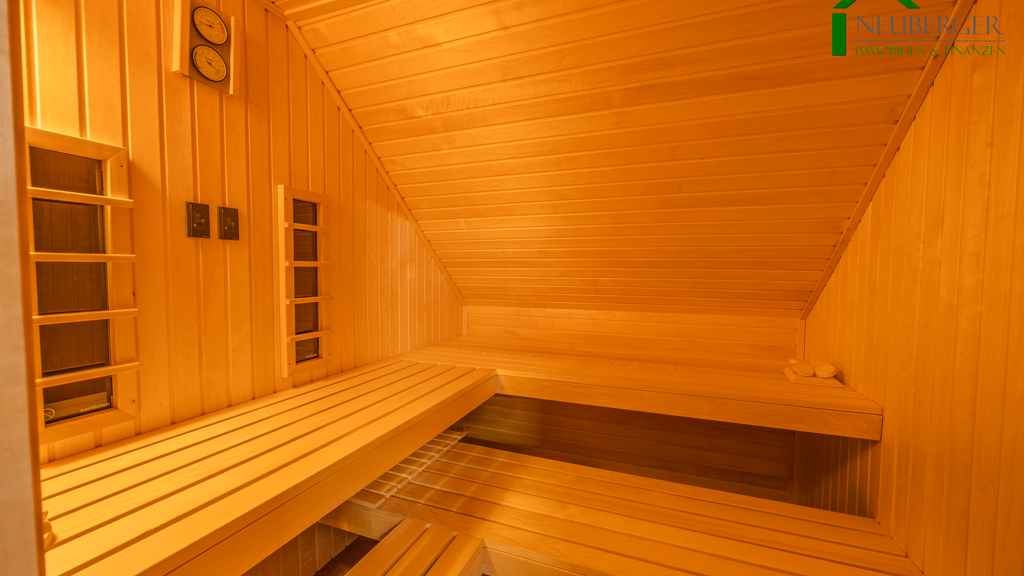 . Spa-Bereich: Sauna mit Elektroofen und Infrarotfunktion, mit großem Relaxraum über der Garage