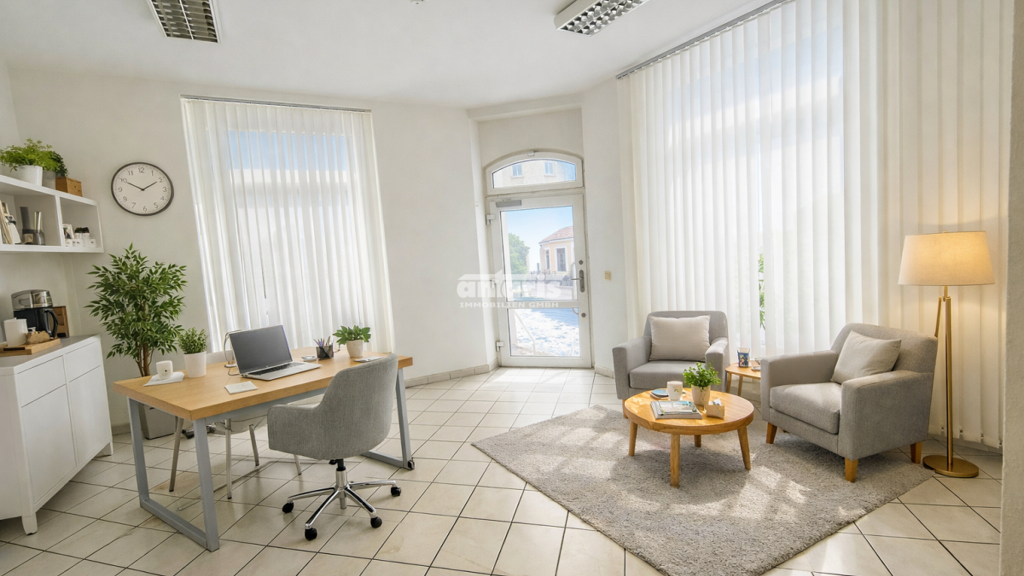 Der freundliche, offene Eingangsbereich mit großzügiger Schaufensterfront zieht sofort die Blicke auf sich und eignet sich perfekt als Verkaufsfläche oder Präsentationsbereich. Dahinter: drei separate Räume, flexibel nutzbar - ob als Lager, Büro, Werkstatt oder Rückzugsbereich.