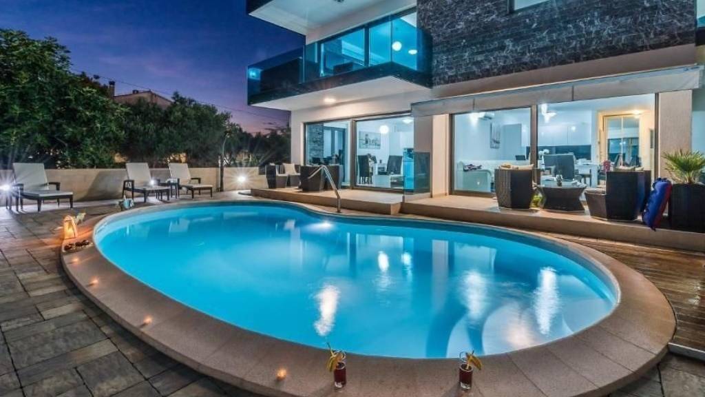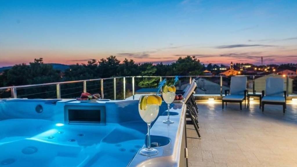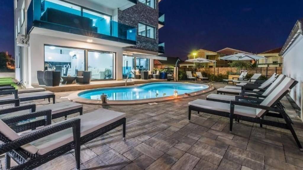 Luksuzno opremljena Villa s 6 stambenih jedinica od kojih svaki ima dvije spavace sobe, kuhinju s dnevnim boravkom, kupaonu i terasa + balkon. Apartmani su kompletno opremljeni u svrhu turizma ( kuhinje s perilicama za sude, masinama za rublje, i svom ostalom opremom.) Vanjska stolarija je termo aluminijska sa troslojnim staklima punjenim plinom za toplinsku izolaciju (parsol boja) Roletne su elektricne, balkonski otvori su velicine 4.35 met. Balkonske ograde su od parsol stakla sa inoks nosacima. Ulazna vrata su protu provalna i protu pozarna. Okucnica je lijepo uredena, laka za odrzavanje s bazenom za sve goste. Bazen je grijani sa toplinskom pumpom. Nekretnina ima izlaz na krovnu terusu koja je opremljena s vanjskom kuhinjom, rostiljem i hidro masaznom kadom za 12 osoba. Prekrasan pogled na cijeli Zadarski arhipelag kao i Velebit se pruza s gornje terase. Udaljena je od gradske plaze Jadro svega 100 metara. I ako je smjestena u strogm centru otoka Vira smjestena je u mirnoj i slijepoj ulici koja pruza intimu svim gostima Ville. Prikljucena je na gradski vodovod i kanalizaciju, elektro mrezu.