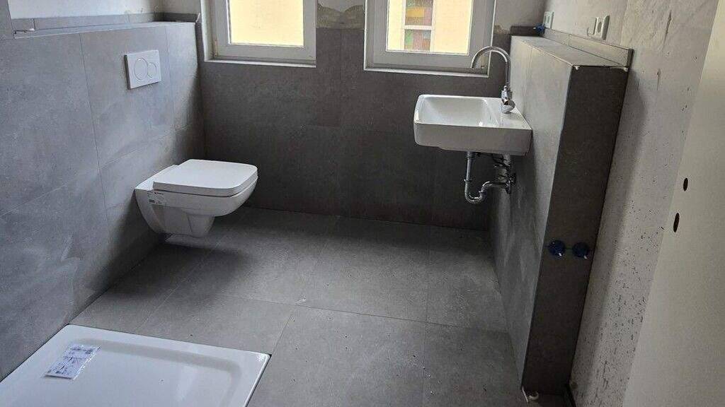 Das Tageslicht-Duschbad überzeugt mit einer modernen Grau-Weiß-Gestaltung und stilvollen grauen Fliesen. Ergänzend steht ein separates WC zur Verfügung - ein komfortables Extra im Alltag.
