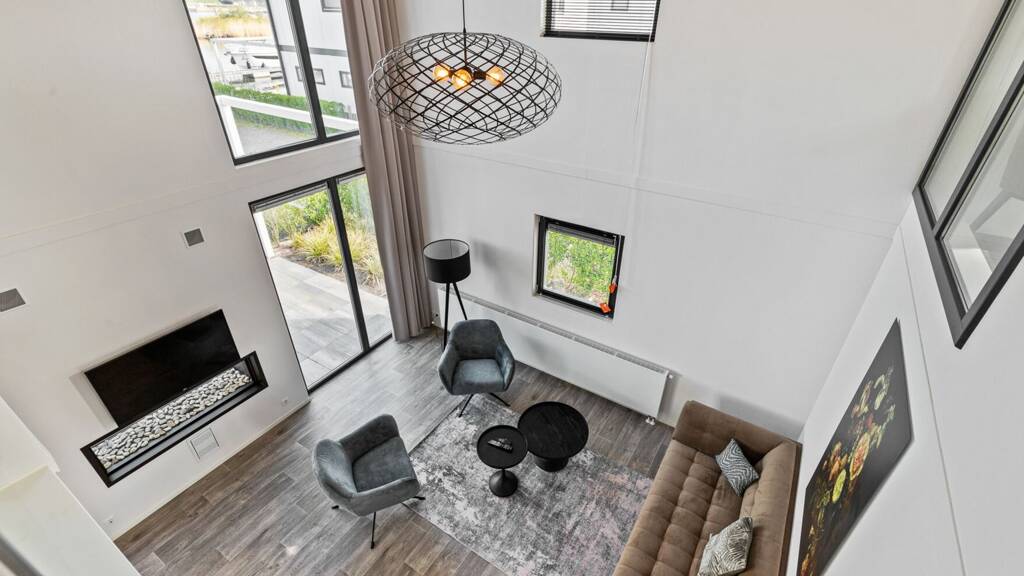 Das Wohnzimmer kombiniert einen gemütlichen, modernen Sitzbereich mit einem wunderschönen offenen Raum, beleuchtet durch große Fensterfronten, die viel natürliches Licht hereinlassen. Der zentrale Punkt ist ein Durchsichtkamin, darüber ein LCD-Fernseher, was für eine warme, einladende Atmosphäre sorgt. Vom bequemen Sitzbereich aus genießen Sie einen ununterbrochenen Blick auf das Wasser, was dem Raum ein friedliches und beruhigendes Aussehen verleiht. Kurz gesagt; ein schöner Ort, um zur Ruhe zu kommen.