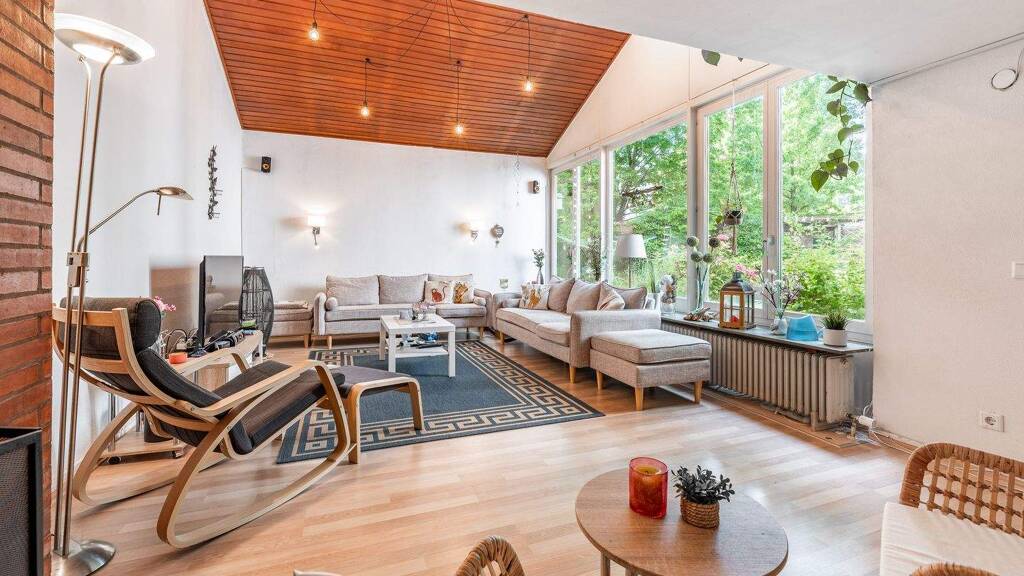 Vom Eingang im Erdgeschoss führt ein halbes Geschoss nach unten ins Wohnniveau. Auf der linken Seite liegt das zweite Schlafzimmer. Rechts daneben gelangen Sie in das großzügige Wohnzimmer mit überdurchschnittlich hoher Decke und großen Fensterfronten. Von hier genießen Sie den Blick auf den charmanten Garten, der natürlich über eine Terrassentür zugänglich ist. Die attraktive Süd-Terrasse eignet sich perfekt für Sonnenstunden und gesellige Abende.