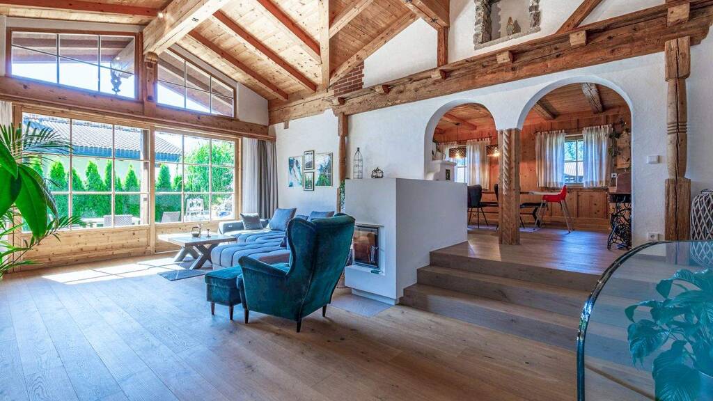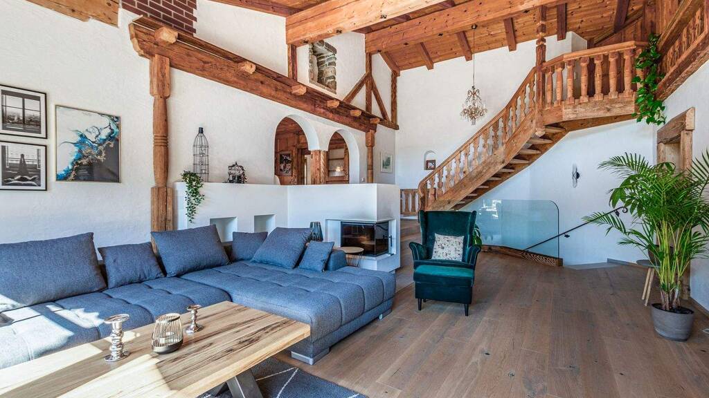 Das Herzstück des Chalets ist die großzügige und hochwertig ausgestattete Dachgeschossmaisonette. Der Wohnbereich mit gemütlicher Stube, offenem Kamin und Kachelofen sorgt für ein behagliches Ambiente. Die Küche bietet direkten Zugang auf die sonnige Westterrasse - perfekt für gesellige Stunden im Freien. Drei Schlafzimmer, darunter ein Masterzimmer mit Wintergarten, Kamin und Schrankraum, runden das Raumangebot auf dieser Ebene ab. Ein Badezimmer mit Dusche ergänzt die Ausstattung. Über eine rustikale Treppe gelangt man ins Dachgeschoss, wo sich ein weiteres Schlafzimmer befindet. Die Kombination aus imposanter Raumhöhe, Sichtdachstuhl sowie sonnigen Terrassen- und Balkonflächen macht diese Einheit zu einem ganz besonderen Wohnerlebnis.