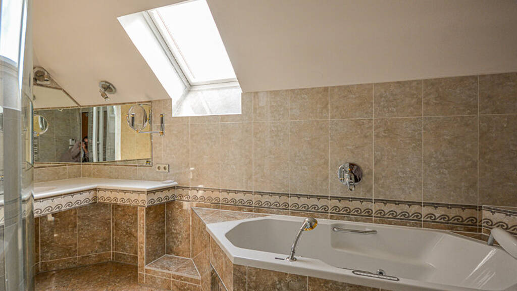 • Böden: Vollholzparkett im Wohn- u. Schlafbereich (tlws. Teppichböden in den SZ),Fliesen in Eingangsbereich, Garderobe, Flur, Bad & WC & KG
