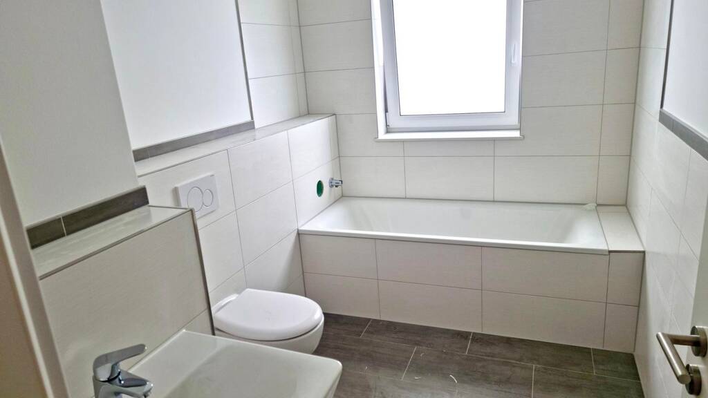 Ein modernes Badezimmer mit hochwertigen Fliesen, Badewanne und praktischen Anschlüssen für eine Waschmaschine sorgt für Komfort. Zusätzlich befindet sich in der Eigentumswohnung ein Gäste-WC. Der Flur verbindet alle Räume miteinander und bietet ausreichend Platz für Garderobe und Stauraum.