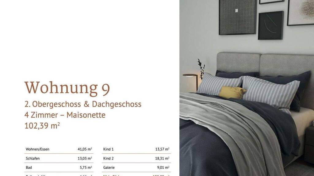 Die Maisonette Wohnung Nummer 9 bietet auf 102,39 m² eine durchdachte Aufteilung mit vier Zimmern und moderner Gestaltung: