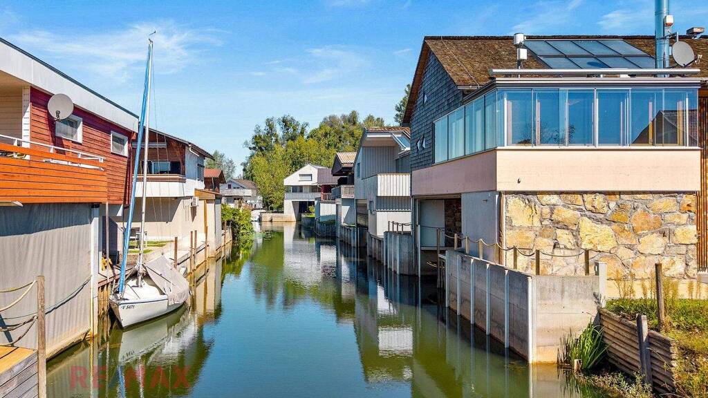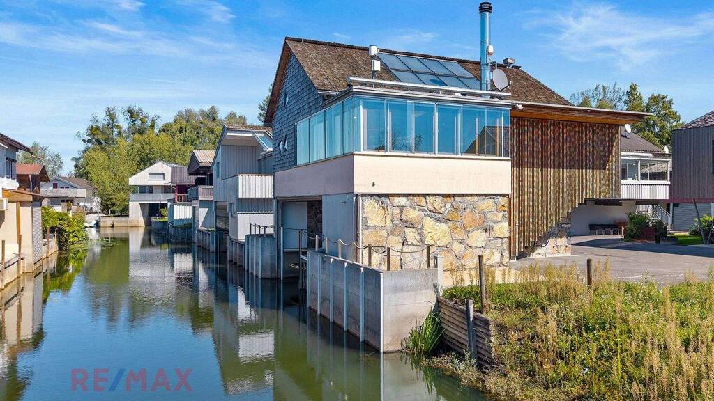 Direkt am breitesten und zugleich tiefsten Seitenkanal gelegen, bietet dieses Objekt eine Perfektion, wie man sie am Bodensee praktisch nicht mehr findet. Die Bootsgarage ist nicht irgendeine Garage - sie ist ein technisches Meisterstück. Der elektrisch-hydraulische Bootslift wurde von Beginn an in die Bausubstanz integriert und trägt bis zu 5,5 Tonnen, TÜV-geprüft. Ihr Boot liegt trocken, geschützt, und immer einsatzbereit - ohne ständige Unterwasserreinigung, ohne jährlichen Anstrich, ohne jegliche Mühe. Rein ins Boot, losfahren - zurückkommen, hochfahren - fertig. Mehr Komfort gibt es nicht. Dieses Bootshaus begeistert nicht nur Bootsfahrer, sondern erfüllt auch höchste Ansprüche an Wohngefühl, Technik und Energieeffizienz. Das massiv gebaute Untergeschoss steht auf einem MESI-Pfahlsystem - eine Bauweise, die Stabilität für Jahrzehnte sicherstellt. Darüber erhebt sich ein offenes, lichtdurchflutetes Wohnhaus, dessen durchdachtes Energiekonzept mit Erdwärmepumpe, Sonnenkollektoren und intelligenter Steuerung bis heute kaum zu übertreffen ist. Selbst an heißen Sommertagen bleiben die Räume spürbar angenehm - ganz ohne teure Kälteerzeugung, nur mit cleverer Technik und Grundwasser.