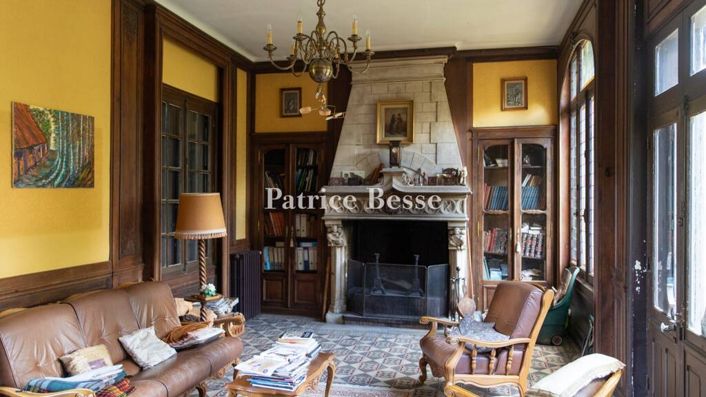 The glazed double-leaf entrance door opens into a vast hall. Opposite the entrance, the wooden staircase climbs upstairs. On each side, two large, basket-handle arched openings lead into a dining room and a lounge. From the dining room, a hallway leads to the kitchen, scullery and access to the rear of the manor as well as service stairs. From the lounge, a corridor leads to a smaller dining room and then a second lounge housed in the large 19th-century extension. The floor is paved with cement tiles throughout, except in the kitchen and hallway. The doors and windows are made of the same light-coloured wood as the staircase. The rooms are flooded with light thanks to the presence of many windows. In the dining room and one of the lounges, there are ashlar monumental fireplaces with hoods that reach up to the ceiling. The fireplace in the lounge is unique in character with a mantelpiece, corbels and jambs in sculpted stone, including a large frieze and depictions of figures. A third stone fireplace in the large lounge is more modest in nature.