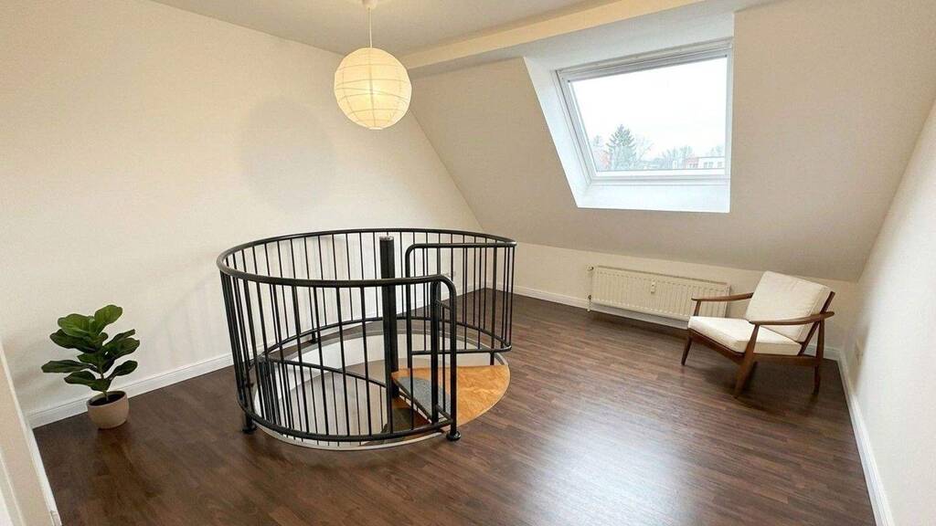 Die Maisonette überzeugt durch eine helle und offene Raumaufteilung auf zwei Ebenen. Im unteren Bereich befindet sich der zentrale Wohnraum mit Wendeltreppe sowie die separate Küche mit direktem Zugang zur Loggia. Die obere Etage bietet einen weiteren großzügigen Wohn- oder Arbeitsbereich und ein separates Schlafzimmer.