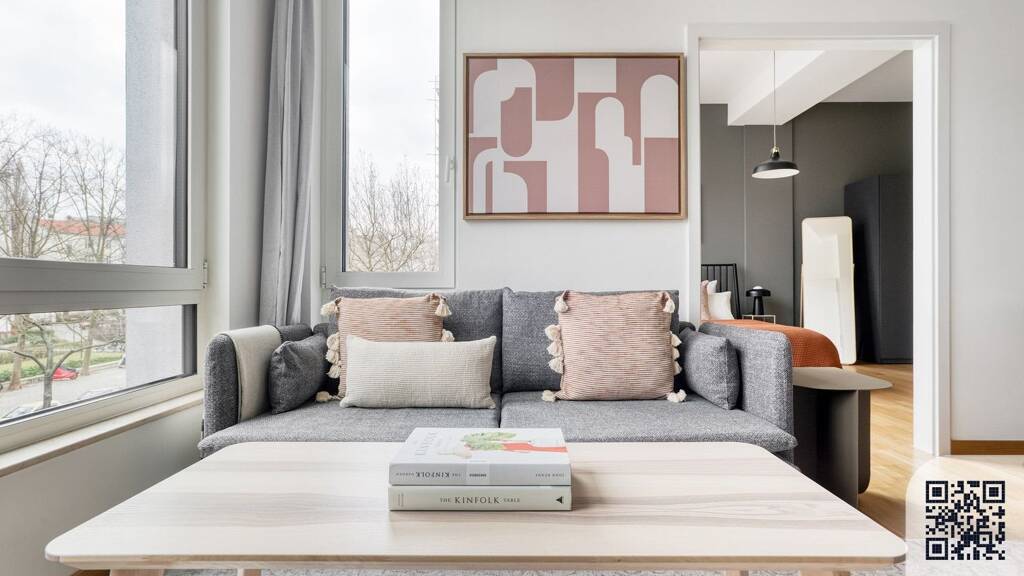 Wie bei jeder Blueground-Wohnung, findest du bei diesem 2-Zimmer-Objekt sorgfältig gestaltete Räumlichkeiten mit tollen Möbeln und einer voll ausgestatteten Küche vor. Und dank unserer hochqualitativen Matratzen hast du die Gewissheit, dich immer wie zu Hause zu fühlen. Wenn du dann für ein wenig Spaß bereit bist, kannst du dich von der Stimmung auf Berliner Straßen mitreißen lassen oder mit dem hochwertigen drahtlosen Lautsprecher oder Smart-TV das Entertainment zu dir nach Hause holen. Diese Wohnung verfügt über eine eigene Waschmaschine mit Trockner.