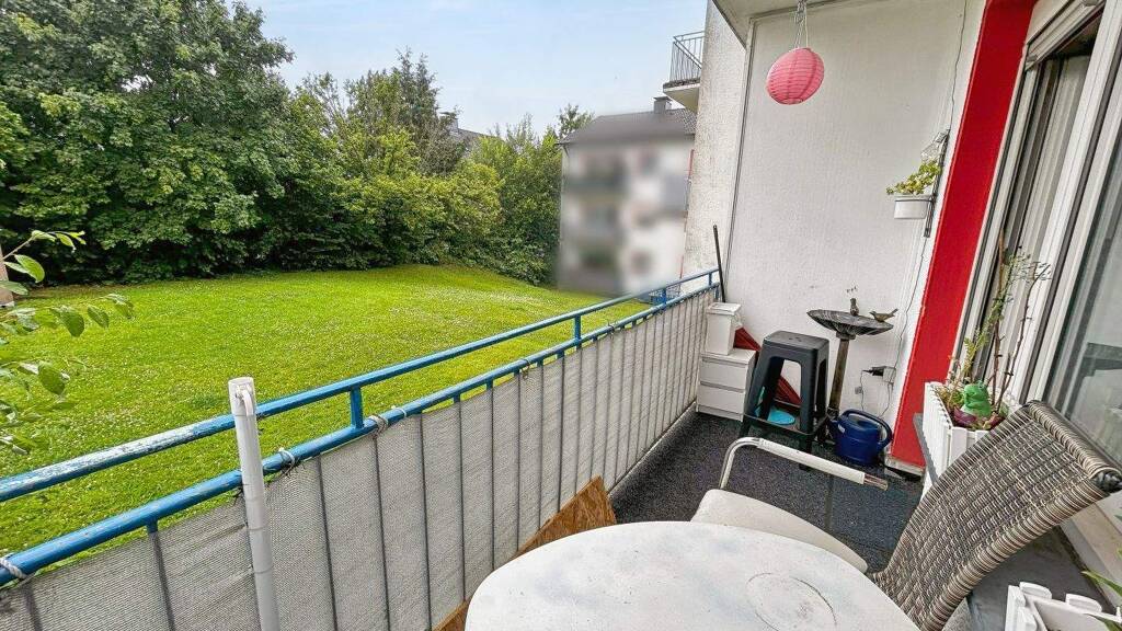 Die Wohnung verfügt über ein gut geschnittenes Wohnzimmer mit Zugang zum rückwärtig gelegenen Balkon, der einen schönen Blick ins Grüne bietet und zur Entspannung einlädt. Das Schlafzimmer bietet ausreichend Platz für einen großen Kleiderschrank und ein Doppelbett. Eine separate Küche, ein Badezimmer mit Fenster sowie ein praktischer Abstellraum ergänzen den Grundriss.