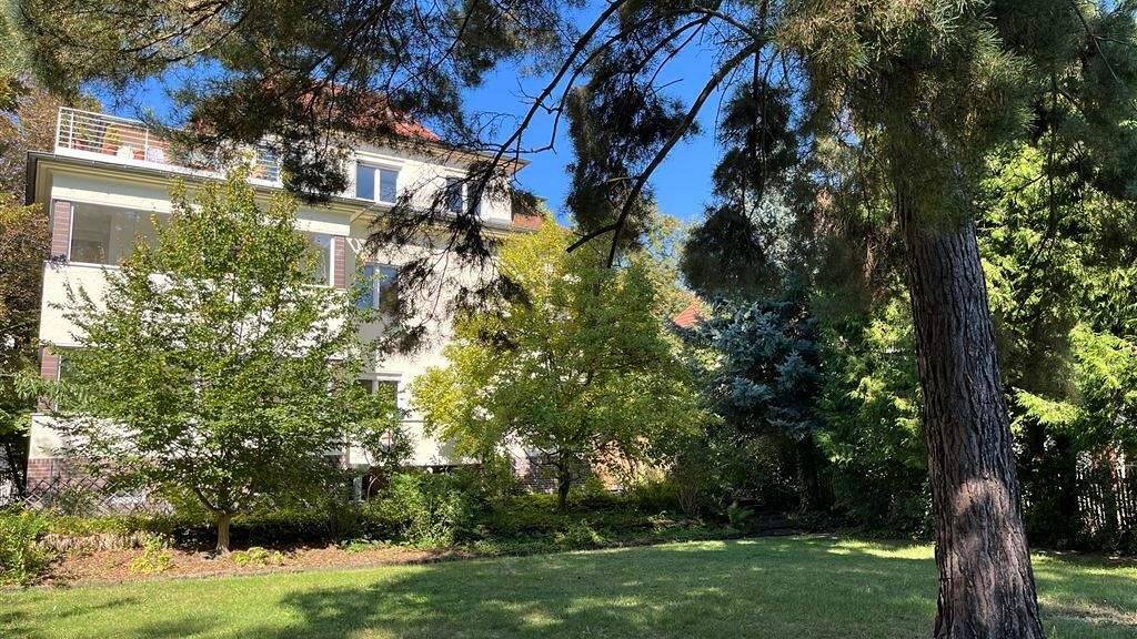 Hinter der ca. 388,06 m² großen Villa befindet sich ein hübscher, gepflegter parkähnlich angelegter Garten mit historischen Steinelementen, die bis heute unter Denkmalschutz stehen.