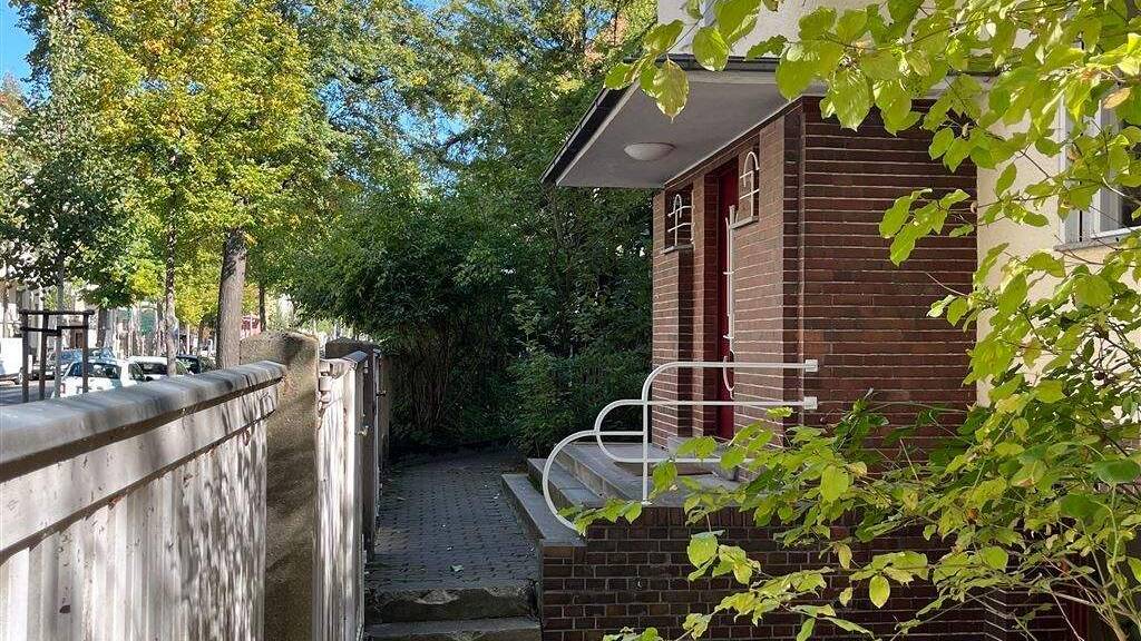 An die Küche schließt sich das Vollbad mit einem hübschen Bleiglasfenster an. Das gemütliche Schlafzimmer liegt zum Garten ausgerichtet und ist mit Einbauschränken und einem separaten Zugang zum Bad ausgestattet. Neben dem Schlafzimmer befindet sich ein Gäste-/Arbeitszimmer. Auf der rechten Seite liegen die Wohnräume. Eine historische Schiebetür verbindet das großzügige Esszimmer mit dem lichtdurchflutetem Wohnzimmer. Besonders in dieser Wohnung ist, dass es eine großzügige Loggia mit eigener Terrasse gibt, die einen separaten Zugang zum Garten erlaubt.