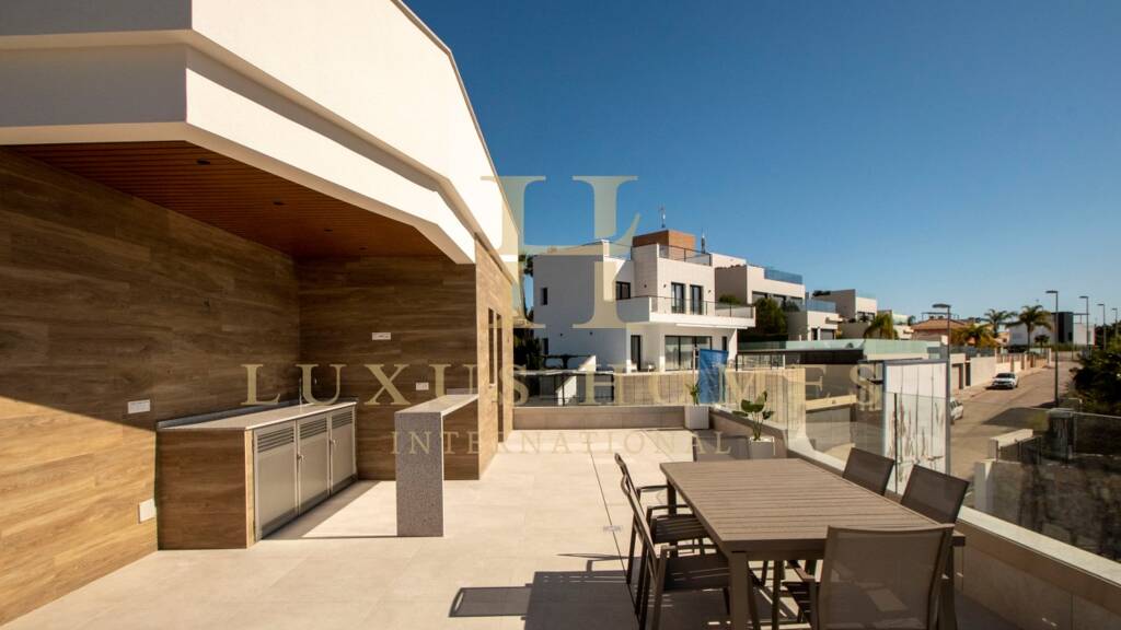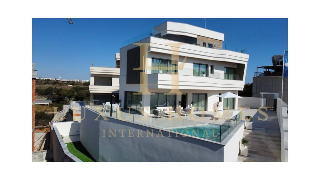 LUXUS HOMES präsentiert ein exklusives Projekt von fünf freistehenden Villen mit vier Schlafzimmern, privaten Swimmingpools und Solarien in der wunderschönen südlichen Region Alicante. Jede Residenz erstreckt sich über ein Grundstück von über 500 m² mit einer bebauten Fläche von 326 m². Alle Häuser verfügen über einen Swimmingpool mit Entspannungsbereich, ein Solarium, eine Tiefgarage, weitläufige Grünflächen und ein Überwachungssystem, das die Sicherheit innerhalb des Grundstücks gewährleistet. Mit organischen Designs, die Eleganz in den gesamten Wohnräumen betonen, durchfluten große Fenster und Glastüren Ihr Zuhause mit natürlichem Licht und Wärme. Im Erdgeschoss jeder Residenz befinden sich ein geräumiges Wohnzimmer mit integrierter Küche, ein Schlafzimmer, eine Toilette und ein Badezimmer. Im ersten Stock befinden sich drei Schlafzimmer und zwei Badezimmer, während sich im Obergeschoss ein großzügiges Solarium mit Abstellraum und Küchenbar befindet. Im Untergeschoss befinden sich Parkplätze, ein Badezimmer und ein Aufzug zu allen Etagen. Dieses Projekt befindet sich in einer Küstenstadt in Orihuela und bietet die Nähe zum Strand, Yachthafen, Einkaufszentren, Golfplätzen, Wander- und Radwegen, die alle zu Fuß erreichbar sind. Die Villen sind von einer Vielzahl von Annehmlichkeiten und Dienstleistungen umgeben, darunter Supermärkte, Bars, Restaurants, Apotheken und vieles mehr. Der Flughafen ist eine 10-minütige Autofahrt entfernt, so dass Komfort und Erreichbarkeit gewährleistet sind.