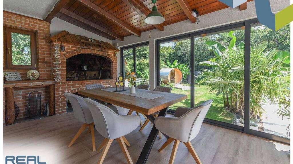 Der Wintergarten als ganzjähriger Aufenthaltsraum mit integrierter Grillstation und die nicht überdachte Terrasse im Außenbereich bieten eine Fläche von insgesamt ca. 70 m².