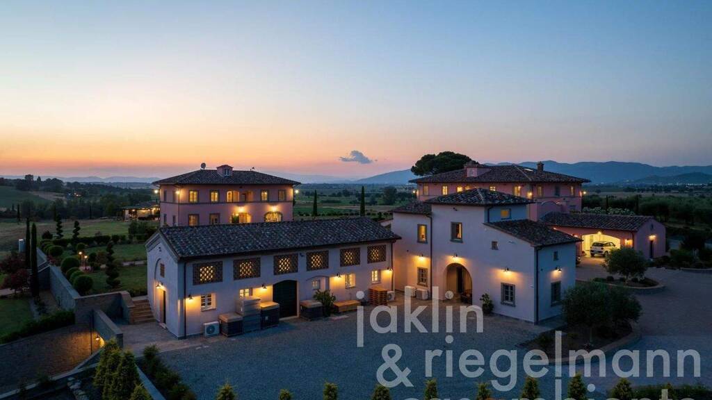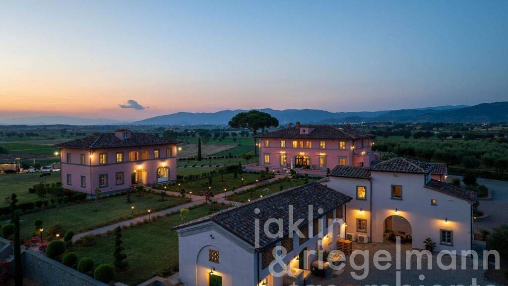 Eingebettet in die sanften Hügel, etwas außerhalb der historischen Stadt Cortona, verkörpert dieses elegante toskanische Anwesen die Essenz des italienischen Lebensstils. Es umfasst mehrere elegante Villen, die komplett neu erbaut wurden und sich durch ihre warmen Rosétöne und klassischen Terrakottadächer auszeichnen. Die Gebäude sind von einem sorgfältig angelegten Park umgeben. Geometrische Beete, geschnittene Zypressen, geometrisch gestutzte Ziersträucher und klassische gepflasterte Wege schaffen ein ruhiges, aristokratisches Ambiente. Ein im Jahr 2019 neu angelegter Weinberg mit fünf Rebsorten (ca. Ein Hektar) und mehr als 200 alte Olivenbäume umgeben die Gebäude im Süden und Osten. Sobald Sie durch die beiden schmiedeeisernen Haupttore fahren, eröffnet sich Ihnen ein weitläufiger Blick auf die Weinberge und Olivenhaine des Val di Chiana, die sich bis zu den fernen Hügeln und dem weiten toskanischen Himmel über Cortona erstrecken.
