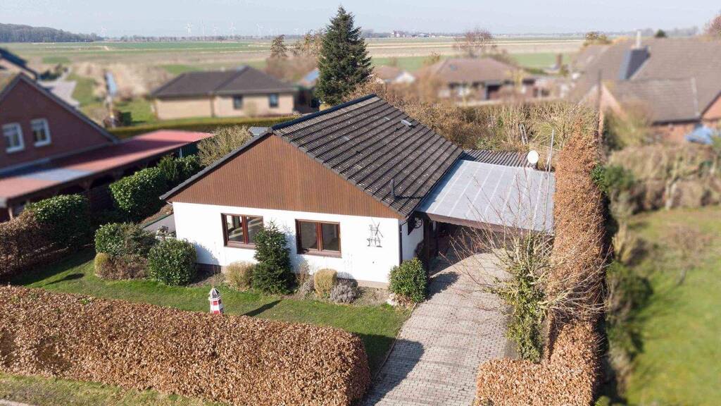 Dieses gepflegte Einfamilienhaus - Fertigbauweise - befindet sich in ruhiger Wohnlage von Pewsum und bietet Ihnen auf rund 86 m² Wohnfläche komfortables und ebenerdiges Wohnen. Die durchdachte Raumaufteilung mit insgesamt vier Zimmern macht die Immobilie sowohl für Paare als auch für kleine Familien besonders attraktiv. Beim Betreten des Hauses gelangen Sie in den zentralen Flurbereich, von dem aus alle Räume bequem erreichbar sind. Das helle und freundliche Wohnzimmer bildet den Mittelpunkt des Hauses und bietet ausreichend Platz für einen gemütlichen Wohn- und Essbereich. Von hier aus haben Sie direkten Zugang zur Terrasse und in den Garten - ideal für entspannte Stunden im Freien. Neben dem Wohnbereich stehen Ihnen drei weitere Zimmer zur Verfügung, die sich flexibel als Schlafzimmer, Kinderzimmer, Gästezimmer oder Büro nutzen lassen. So lässt sich das Haus gut an unterschiedliche Lebenssituationen anpassen. Die neuwertige Einbauküche bietet ausreichend Platz zum Kochen. Ein direkt an die Küche angrenzender Abstellraum beherbergt die Versorgungsanschlüsse und die Heizungsanlage und bietet praktischen Stauraum. Das funktional geschnittene Duschbad fügt sich praktisch in den Grundriss ein und rundet das Raumangebot ab. Das Grundstück bietet einen pflegeleicht angelegten Gartenbereich mit vielfältigen Möglichkeiten zur Gestaltung. Ob entspannte Stunden auf der Terrasse, ein Grillabend mit Freunden oder Platz zum Spielen für Kinder - hier können Sie den Außenbereich ganz nach Ihren Vorstellungen nutzen.