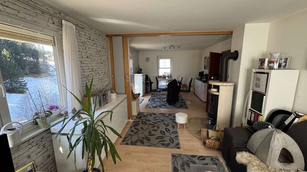Hier erwarten Sie ein gemütliches Schlafzimmer mit Zugang zum Balkon, ein großzügiges Wohnzimmer mit Kamin (ca. 27 m²) sowie der direkte Zugang zur sonnigen Terrasse mit herrlichem Ausblick. Der offen gestaltete Wohn- und Essbereich wird durch einen modernen Kaminofen (2024) bereichert, der eine behagliche Wohnatmosphäre schafft. Eine helle Küche mit Essbereich lädt zu geselligen Stunden ein. Ein Badezimmer mit Badewanne, WC und Fenster rundet diese Ebene ab.
