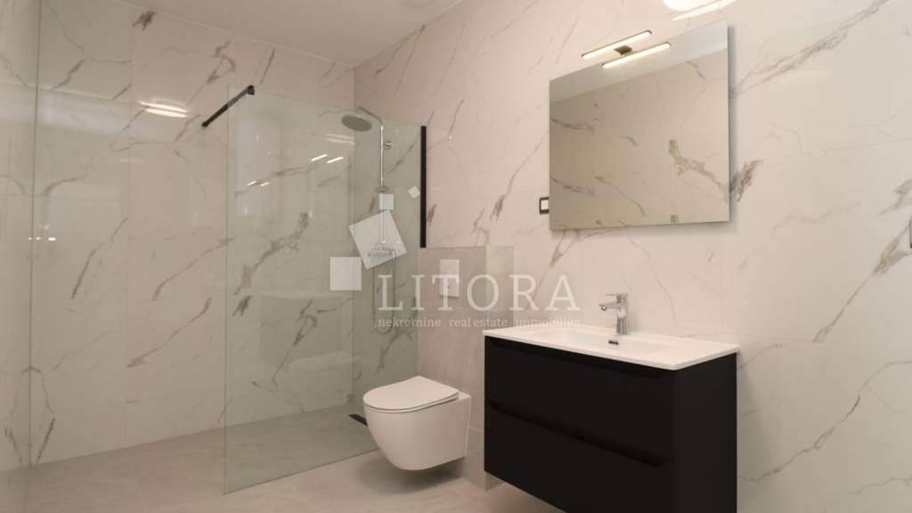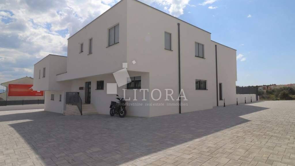 Vodice, Neubau, komfortable 2-Zimmer-Wohnung mit Terrasse und Meerblick, mit einer Nutzfläche von 81,76 m². Sie befindet sich im 1. Stock eines kleineren Wohngebäudes mit 6 Wohneinheiten und ist nach Westen ausgerichtet. Die Wohnung besteht aus einem Eingangsbereich, Flur, Badezimmer, zwei Schlafzimmern sowie einem geräumigen Wohnzimmer mit Küche und Essbereich, von dem aus man auf die Terrasse gelangt. Die überdachte Terrasse mit einer Fläche von 9,59 m² bietet einen Meerblick. Zur Wohnung gehören zwei Parkplätze. Sie ist ausgestattet mit Fußbodenheizung im Badezimmer, einer Bosch-Klimaanlage zum Heizen und Kühlen, Aluminiumfenstern mit elektrisch betriebenen Rollläden sowie einer Sicherheitstür. Das Gebäude befindet sich 1.700 Meter vom Strand und 1.300 Meter vom Zentrum sowie allen wichtigen Einrichtungen entfernt.