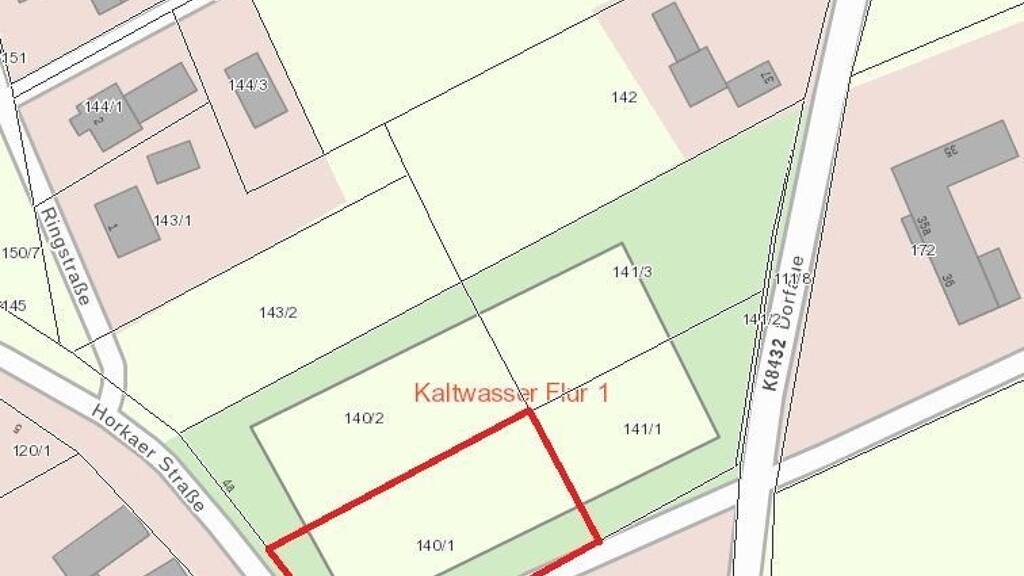 Zum Verkauf steht eines von drei Baugrundstücken in der Ortschaft Kaltwasser mit Potential zum Eigenheimbau. Das Flurstück liegt zwischen der Horkaer Str. und der Dorfauen, umfasst 1.620 m² und ist als Baugrundstück klassifiziert. Ein Bebauungsplan liegt nicht vor. Das derzeitige Wiesen-Grundstück ist teilerschlossen. Versorgungsleitungen für Trinkwasser / Frischwasser, Strom und Internet / Telefonie ist über beide angrenzenden Straßen möglich. Die Abwasserversorgung erfolgt dezentral (keine Entwässerung über städtische oder Gemeindeleitungen). Baumaßnahmen und Kosten für die Errichtung von Hausanschlüssen trägt satzungsmäßig der Grundstückseigentümer.