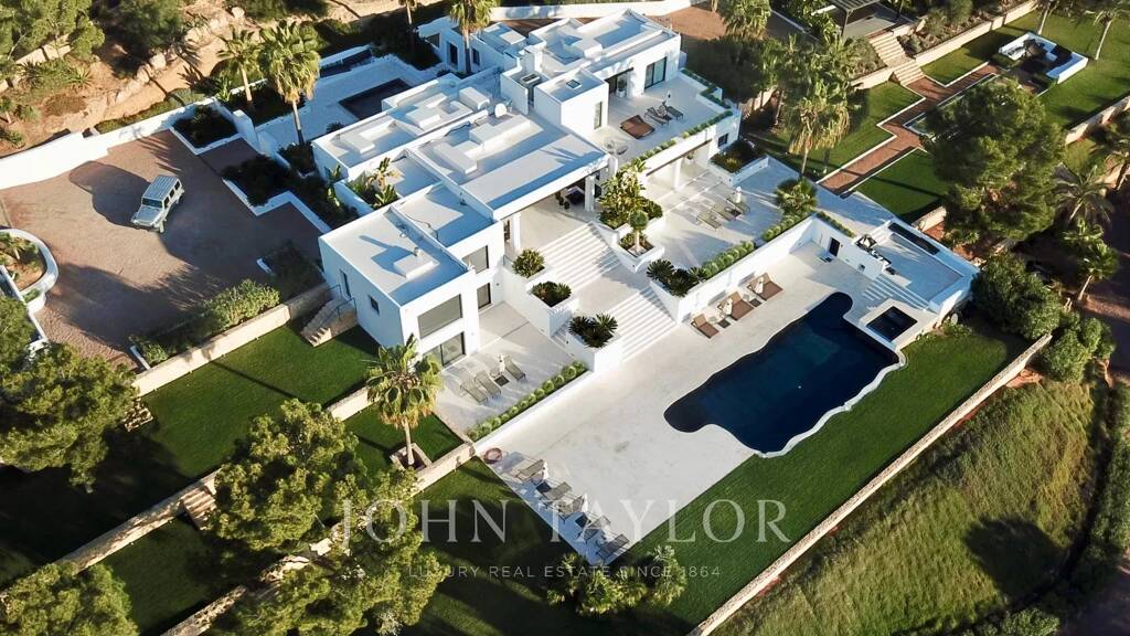 This magnificient villa is a modern design masterpiece featuring six bedroom suites and a separate staff apartment, set on expansive acres of lush green gardens. Situated in the exclusive area of Cap Martinet, it offers majestic sweeping sea views extending to Formentera and Dalt Vila, with easy access to Ibiza Town and other desirable locations, just 450 meters from the sea.