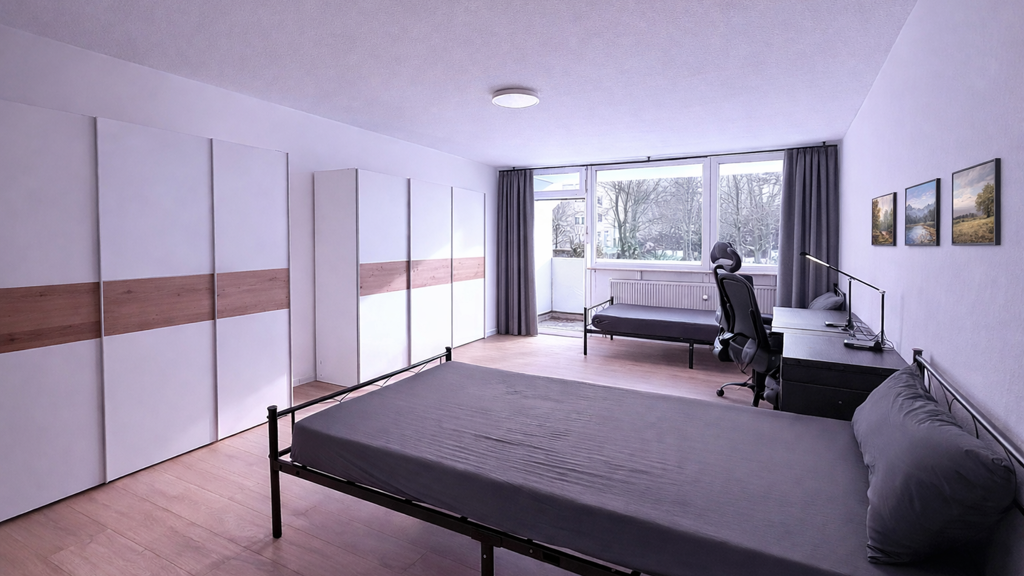 Dank der großzügigen Zimmergröße eignet sich das Zimmer auch hervorragend zur gemeinsamen Nutzung (z. B. als Doppelbelegung) mit zusätzlicher Möblierung. In diesem Fall beträgt die Warmmiete 390 € pro Person.