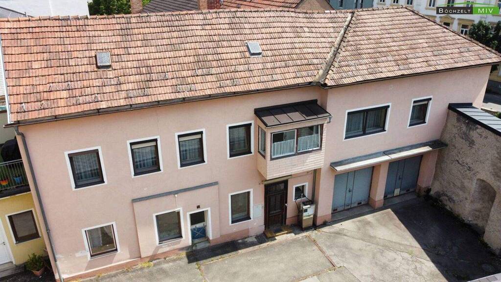 Die Innenstadtliegenschaft besteht aus dem Haupthaus mit integrierter Doppelgarage, dem Wohnbereich, welcher sich auf das Erd- und Obergeschoss verteilt, sowie einem zusätzlichen Bereich im Erdgeschoss mit ca. 31 m², der ideal zu einer kleinen Garçonnière oder einem Büro umgebaut werden kann. Zudem bestehen noch 2 Carportabstellplätze im Innenhof, sowie der Garten samt zusätzlicher Zufahrt Richtung Schmittstraße.