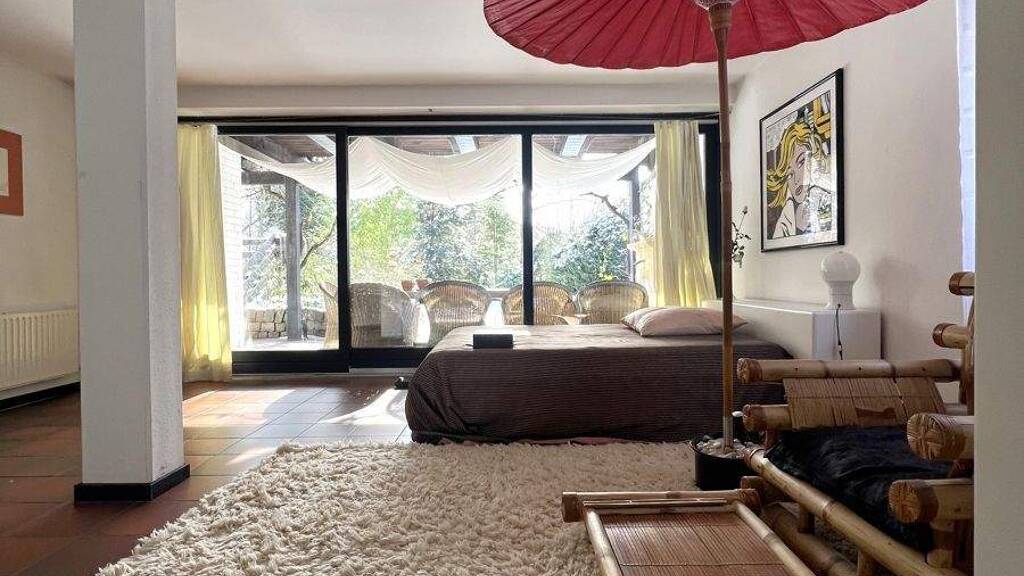 Vom Wohnzimmer aus gelangen Sie auf den überdachten Balkon mit Übergang in den nach Südwesten ausgerichteten Garten. Besonders hervorzuheben ist die beeindruckende Deckenhöhe bis zu 8 Metern, die ein außergewöhnliches Raumgefühl schafft.