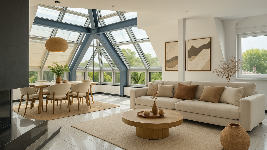 Großzügiger Wohn-Essbereich mit Galerie: Sie genießen offene Raumstrukturen, helle Flächen und eine gläserne Dachkuppel, die Ihre Räume in Tageslicht taucht.