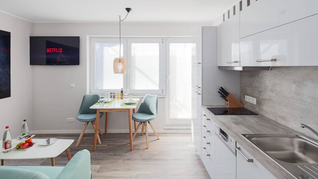 Voll eingerichtete Studiowohnung (Renovierung und Erstbezug 2019) mit hochwertiger Einbauküche, Balkon, Waschmaschine, Kaffeevollautomat, 50" Flat. Sie schlafen auf einem TRECA **** Hotelbett 140 x 200 cm, Ihre Gäste auf einer gemütlichen Schlafcouch Alle Verbrauchskosten incl. W-LAN, NETFLIX und einem Tiefgaragenstellplatz stehen kostenlos zur Verfügung. In der Küche stehen Geschirr, Töpfe, Kaffeemaschine, Toaster, Wasserkocher, Mikrowelle, Backofen, Kühlschrank, Gewürze und alles was man zum Kochen benötigt bereit. Bettwäsche und Handtücher werden gestellt.