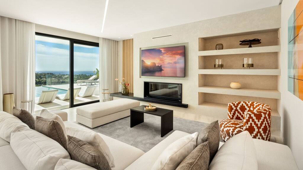 Inmitten der prestigeträchtigen Umgebung von El Paraiso präsentiert sich diese moderne Villa als eine architektonische Meisterleistung, die spektakuläre Panoramablicke von ihrer erhöhten Lage aus offenbart. Von hier aus erstreckt sich der Blick über den El Paraiso Golfplatz, die beeindruckende La Concha und die herrliche Küstenlinie des Mittelmeers. Dank der südlichen Ausrichtung erfreut sich diese Residenz atemberaubender Sonnenaufgänge und -untergänge. Die großzügigen Terrassen laden zu unvergesslichen Stunden im Freien ein. Der Hauptterrassenbereich bietet ruhige Rückzugsorte, eine lebhafte BBQ-Area, einen Freiluft-Essbereich sowie einen einladenden Infinity-Pool ohne Kante und einen Außen-Jacuzzi. Das offene Wohnkonzept harmoniert perfekt mit den Außenbereichen und schafft eine einladende Verbindung zwischen drinnen und draußen. Der stilvoll gestaltete Wohnbereich besticht durch eine neutrale Farbpalette, die durch sorgfältig ausgewählte Akzente ergänzt wird. Angrenzend an den Wohnraum bieten der Essbereich und die voll ausgestattete Küche sowohl Funktionalität als auch ästhetischen Reiz. Die großzügige Kücheninsel, verbunden mit einem schwebenden Esstisch, schafft vielseitigen Platz für kulinarische Kreationen und gesellige Zusammenkünfte. Durchdachte Stauraumlösungen gewährleisten Ordnung. Die Schlafzimmer sind das Ergebnis brillanter Gestaltung und strahlen sowohl Eleganz als auch Behaglichkeit aus. Das Hauptschlafzimmer bietet atemberaubende Ausblicke und direkten Zugang zur oberen Terrasse, die auch mit anderen Schlafzimmern verbunden ist. Ein begehbarer Kleiderschrank sorgt für ausreichend Stauraum und umfasst einen speziellen Bereich zur Präsentation von Schmuck und Accessoires. Das luxuriös gestaltete Hauptbad, gekleidet in beruhigendem Marmor, verfügt über ein prächtiges Doppelwaschbecken, eine Dusche und eine Badewanne, die den Blick einfängt. Ein Arbeitszimmer fördert die Produktivität, während der exklusive SPA-Bereich mit Sauna und türkischem Bad zur Entspannung einlädt. Ein Highlight der Villa ist der atemberaubende Unterhaltungsraum, der einen eigenen Kinobereich, einen Billardtisch sowie eine individuell gestaltete Bar mit zwei Weinkühlern beherbergt - der perfekte Ort für unvergessliche Momente. Diese Villa vereint stilvollen Komfort und Funktionalität und ist ein Paradebeispiel für das erstklassige Wohnen an der Costa del Sol.