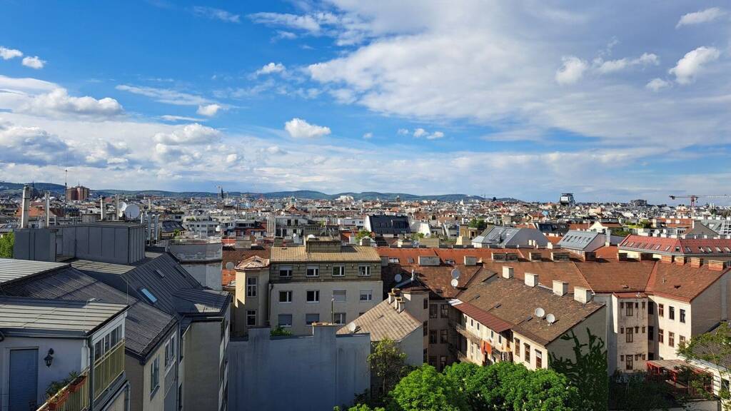 Von den Terrassen oberhalb der zweiten Wohnebene ergibt sich ein wundervoller 360 Grad Rundblick über die Innenstadt bis zur Steinhofkirche sowie Kahlenberg und Leopoldsberg.