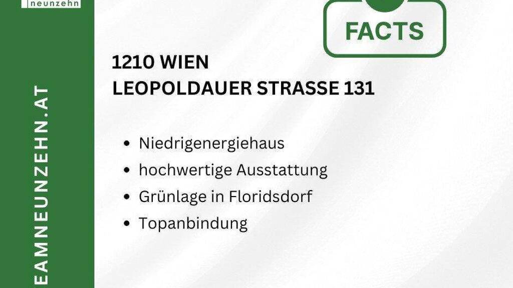 * Öffis: Buslinie 28a/29a in 2 Gehminuten. 4 Busstationen zu U6 und S-Bahn Floridsdorf, 3 Stationen zum Siemensstraße Bahnhof, 12 Stationen zur U1 Leopoldau