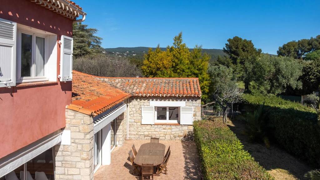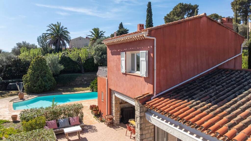 The villa is set within beautifully landscaped grounds of approximately 1,600 sqm, a serene Mediterranean garden designed for relaxation and discretion. A swimming pool, garage, and cellar complete the outdoor amenities.