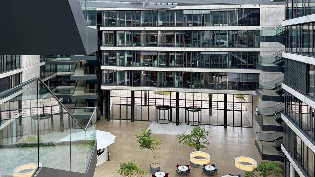 Heben Sie sich in diesem auffälligen geschwungenen Gebäude in Bonn von der Masse ab. Die Büros im FGS Campus liegen um ein Atrium mit Sonnendach herum, in dem ein Café, ein Fitnessstudio, eine Bibliothek und eine Kindertagesstätte untergebracht sind.