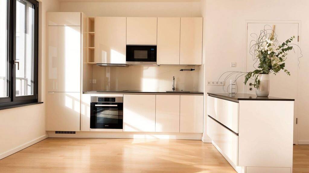 Die maßgefertigte Küche fügt sich harmonisch in das Wohnkonzept ein und überzeugt durch modernes Design, hochwertige Geräte und Liebe zum Detail - ideal für genussvolle Abende mit Freunden oder entspannte Morgenstunden mit Blick in den geschmackvoll gestalteten, weitläufigen und begrünten Innenbereich.