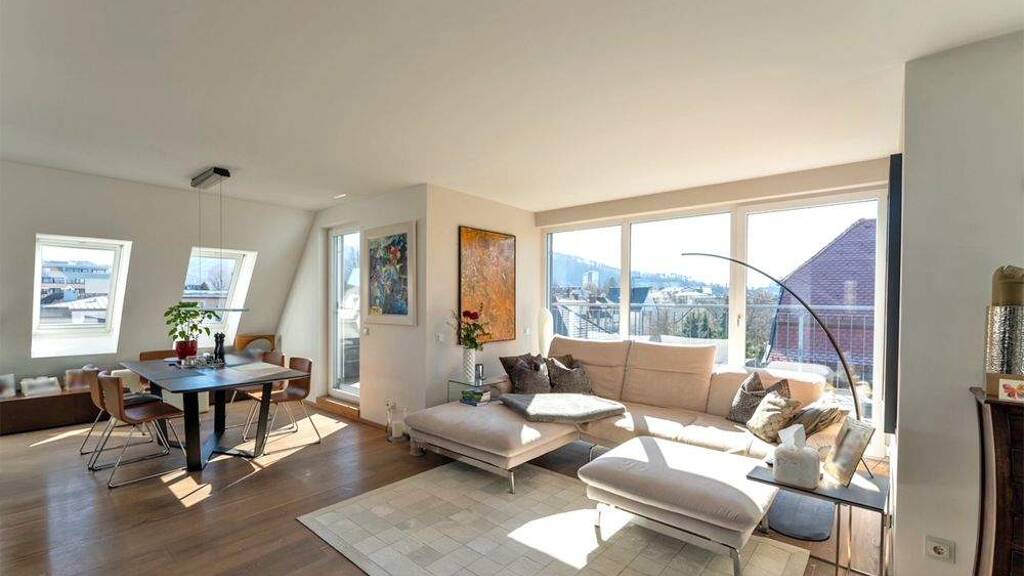 Die Dachgeschossebene bildet das Herzstück der Maisonettewohnung. Der großzügige und lichtdurchflutete Wohn-/Koch- und Essbereich mit offener Küche samt Kochinsel und Markengeräten wird von raumhohen Panoramaverglasungen umrahmt, die einen herrlichen Blick auf die Salzach, die Festung Hohensalzburg und die umliegende Bergwelt freigeben.