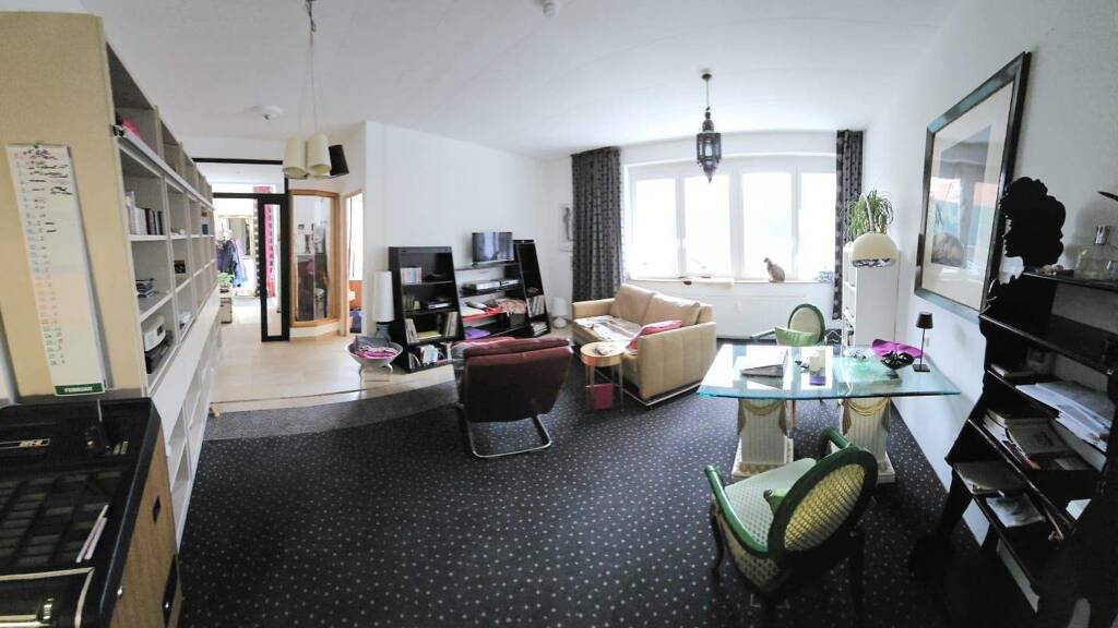 an/umfahrbare Gewerbehalle mit Beladerampe; Satteldach mit Raumhöhe 5,40 m Höhe; 2 Wohnungen zur Gartenseite; EG-Wohnung mit Gartennutzung und Raumhöhe von 3 m; großem Tageslichtbad; Gäste-Wc, offene Küche; 2 Schlafzimmer; Flur, Diele; OG: 3-4 Zi-Wohnung Tageslichtbad , Gäste-WC, Küche, Balkon; 5 Stellplätze am Haus