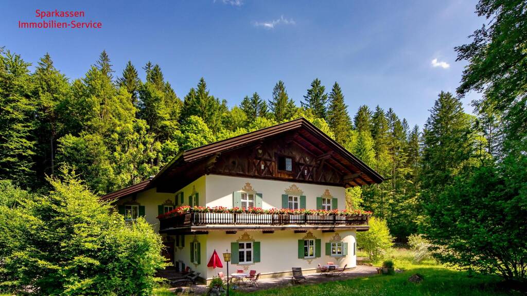 Erbaut um 1906 diente dieses malerisch gelegene Anwesen seinen damaligen Eigentümern als Domizil der sogenannten Sommerfrische. Dichter, Denker, Maler und Musiker versammelten sich zu dieser Zeit gerne in den bayerischen Voralpen und genossen die großartige Kulisse der Berge und die erfrischende Kühle von Wiesen, Wäldern, Bächen und Seen. Mit einer herrlichen Lage inmitten grüner Wiesen, am Waldrand und einem großartigen Ausblick bis zur Zugspitze überwältigt dieses besondere Idyll seine Besucher. Derzeit wird das Haus als Ferienhaus und Pensionsbetrieb genutzt und befindet sich in einem weitgehenden und sehr gepflegten Originalzustand in Bezug auf Fassade, Aufteilung der Räume sowie viele Teile der sehr besonderen Innenausstattung. Architektonisch entspricht das Anwesen einer Landhaus-Villa mit zusätzlichen dekorativen Elementen wie Fresken sowie dem großen Abbild einer Heiligenfigur an der Nordseite. Großzügige Terrassenflächen umgeben das Haupthaus, welches auf einer kleinen Anhöhe liegt, und lassen das parkähnliche Grundstück überblicken. Eine holzvertäfelte Weinstube und ein Salon mit Delfter Kachelwänden laden im Inneren zum Sinnieren, Lesen oder Spielen ein. Ein Speisesaal mit Runderker und ein gemauerter Wintergarten mit Rundumblick befinden sich im erhöhten Erdgeschoss. Sieben Schlafzimmer und sechs Bäder bieten im 1. und 2. Obergeschoss viel Raum für Familie und Gäste.