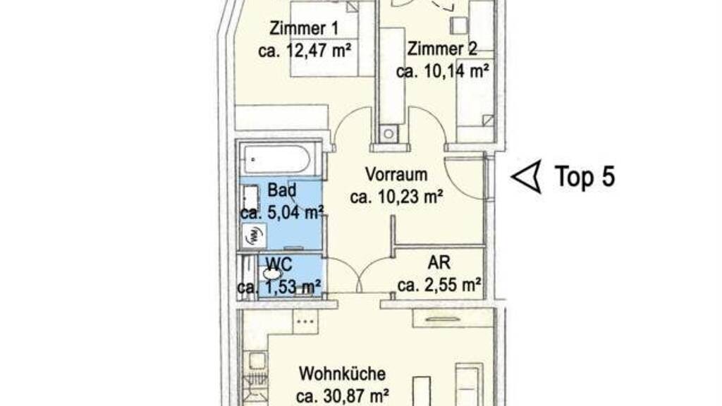 Die Wohnfläche von ca. 73 m² unterteilt sich in einen Eingangsbereich mit zentralem Vorraum, zwei nach Norden ausgerichtete Zimmer - jeweils mit Ausgang auf die Terrasse, innenliegend Abstellraum, Badezimmer und separates WC sowie einen gemütlichen Wohn-Essbereich mit offener Küche und Zugang auf die südlich gelegene Loggia. Zur Wohnung gehört außerdem ein Kellerabteil.