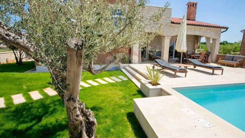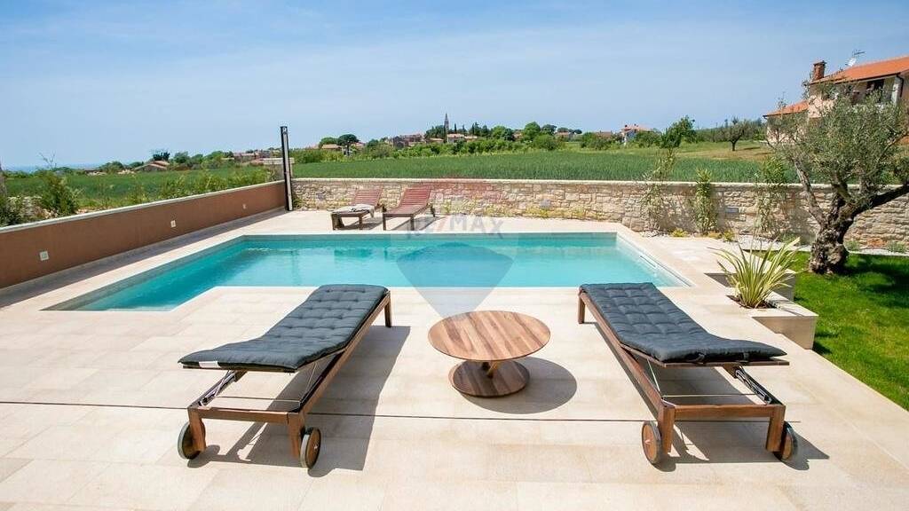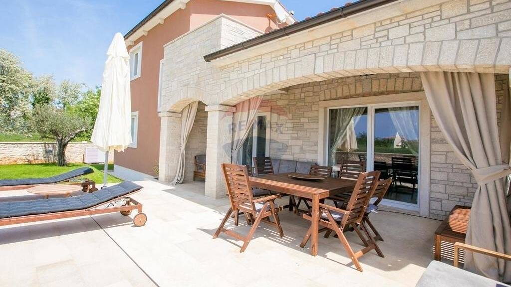 Am Rand eines charmanten Ort mit Infrastruktur und nah bei Porec liegt dieses schöne Haus. Durch die erhöhte Lage haben Sie den Meerblick schon vom Grundstück aus. Das Haus ist Süd-Westlich ausgerichtet, vor dem Haus, auf der Seite des Pools, grenzt das Grundstück an einem großen Feld, was Ihnen den freien Blick bietet. Im Erdgeschoss erwartet Sie ein gemütlicher Wohnbereich, der an die Küche und Essbereich angebunden ist. Nebendran befinden sich zwei Schlafzimmer und ein Bad. Im Obergeschoss stehe Ihnen weitere zwei Schlafzimmer und ein Bad zur Verfügung. Hier haben Sie auch eine Terrasse. Vor dem Haus haben Sie eine überdachte Terrasse, einen 24 m² großen Pool, eine schön gelegte Rasenfläche mit Olivenbäumen, gemauerten Steinkamin-Grill und Waschbecken sowie zwei Parkplätze mit Pergola.