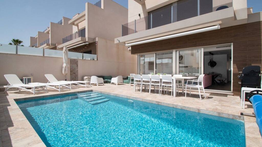 Die jetzigen Eigentümer haben die Immobilie zu einem hohen Standard eingerichtet und dekoriert und verkaufen sie voll möbliert und ausgestattet. Der Innenbereich besteht aus einem hellen und geräumigen offenen Wohn- und Essbereich mit großen Terrassentüren, die Zugang zur Terrasse und zum Garten bieten. Im Hauptwohnbereich befindet sich eine moderne Küche im amerikanischen Stil mit hohen und niedrigen Schränken, die in schlichtem Weiß gehalten sind. Das Haus verfügt über fünf große Schlafzimmer, 4 modern ausgestattete Bäder und im Untergeschoss befindet sich ein zweiter Wohnbereich...ideal für größere Familien oder wenn Gäste zu Besuch kommen. Weitere Highlights der Immobilie sind Klimaanlage, Heizung, Grill, Waschküche und Abstellraum.